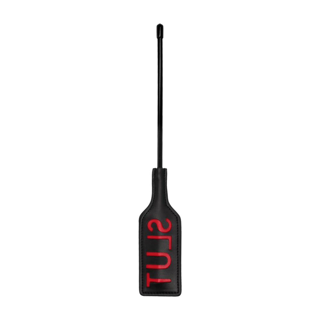 Leave a lasting impression on your partner. This short handled rectangular shaped crop is the perfect way to discipline your partner. Leave a lasting impression on your sub. The word SLUT is reversed so it will show up on their skin